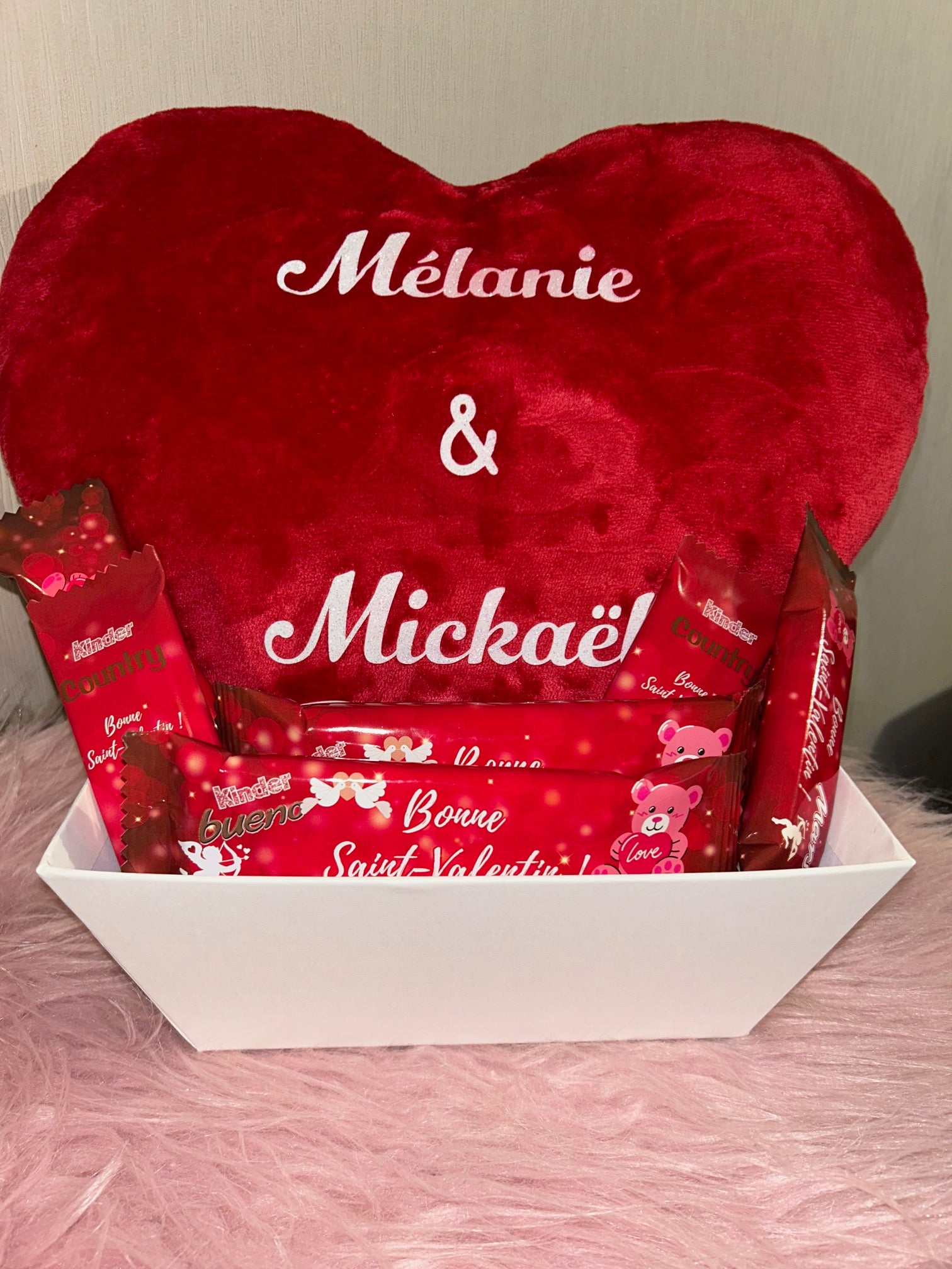 Box simple : 2 Kinder bueno, 2 country, 1 snickers, 1 mars, 2 nutella & un coussin portant vos prénoms ou le message de votre choix