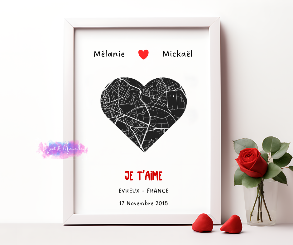 🖤 Le cœur est composé du plan de la ville choisie, pour un rendu moderne, élégant et intemporel.