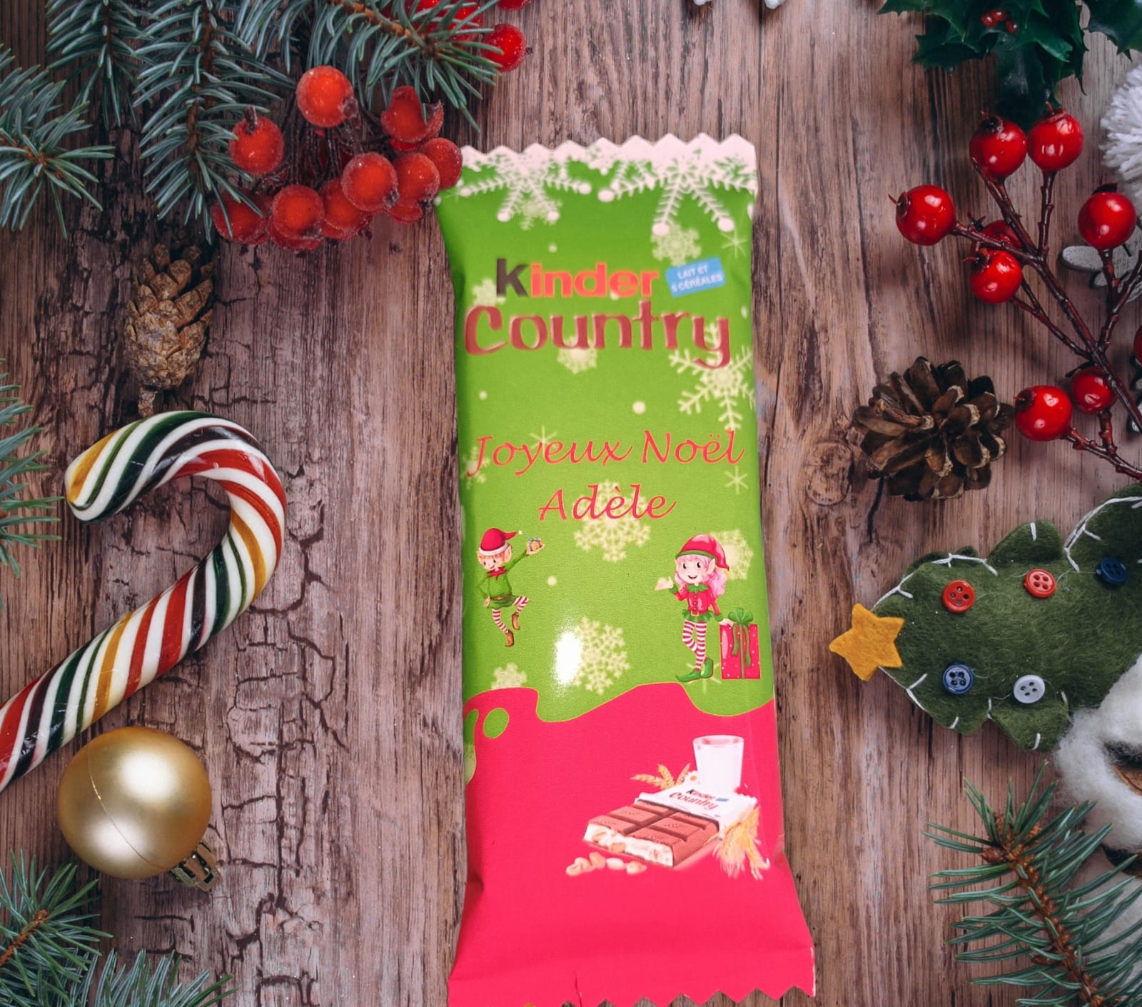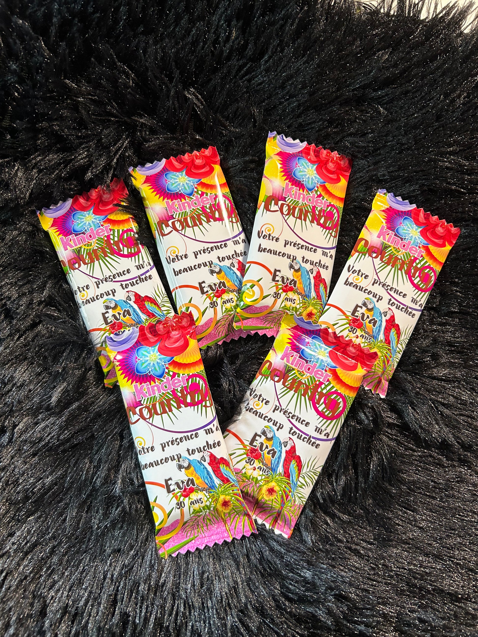 Faites plaisir à vos invités avec Kinder country ! Ces délicieuses barres de chocolat, dans leur emballage personnalisé, seront un ajout parfait à tous vos évènements. Offrez-leur une expérience unique avec ces friandises savoureuses et uniques en leur genre.